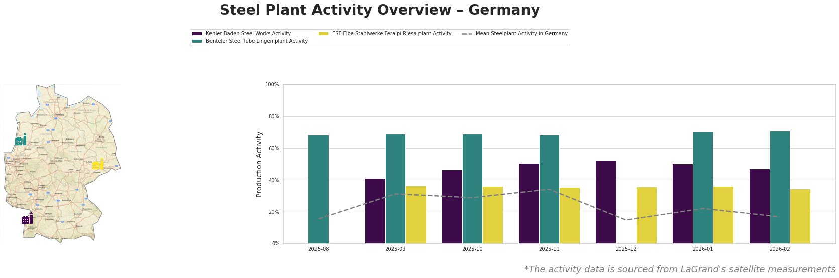 Bar chart and satellite map of steel production activity in Germany