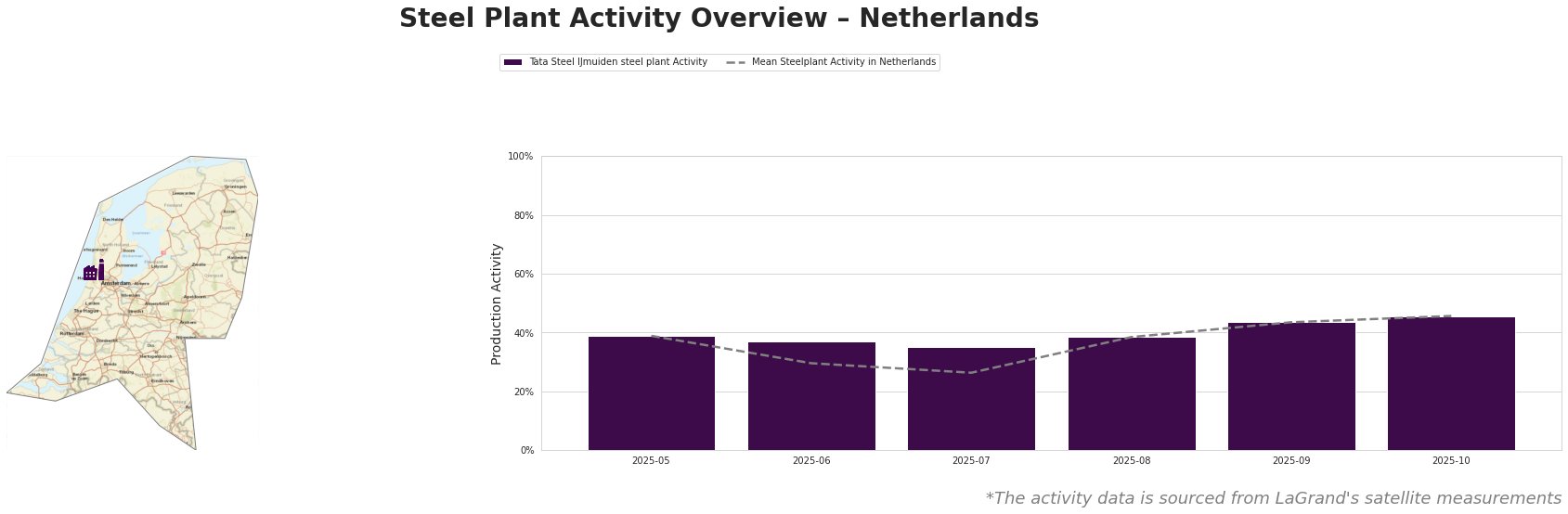 The Netherlands steel market shows a very positive sentiment driven by Tata Steel Nederland’s strategic move toward green steel production. Recent news articles including “Tata Steel Nederland to acquire Wattenfall power plants to support transition to green metallurgy” and “Tata Steel Nederland to acquire Vattenfall power plants to support green steel transition” (Published: 2025-11-18T23:00:00Z and 2025-11-17T23:00:00Z respectively) detail Tata Steel’s acquisition of Vattenfall power plants. While these acquisitions are prospective (January 1, 2026), current observed plant activity does not yet reflect the impact of this transition, as no direct relationship can be established between the news and the most recent activity data.