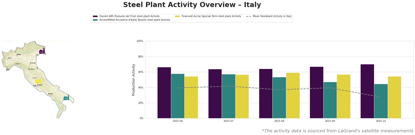 In Italy, steel production has faced notable declines, with the headline issue being an 11.8% drop in production reported in the article “Italy reduced steel production by 11.8% m/m in November“. This decline corresponds with satellite activity data, showing reduced operational levels at key steel plants, particularly in November.