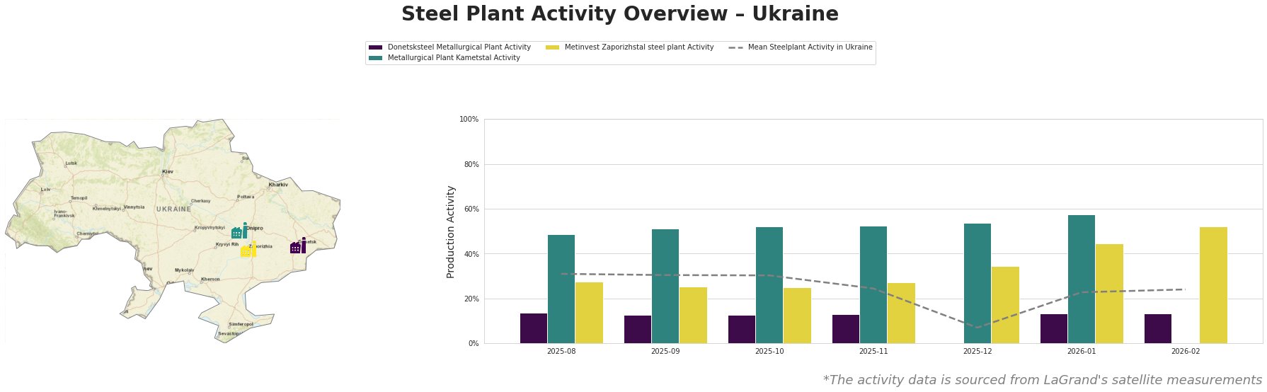 The satellite-observed activity at Zaporizhstal indicates a considerable decline in activity, particularly following the reported 15.8% decrease in January production related to operational interruptions. Kametstal exhibited stable activity months leading up to January, holding at 58%, but still fell short of pre-war activities during the recent months due to energy constraints as highlighted in Industrial production in Ukraine fell by 2.4% y/y in 2025. Donetsksteel has remained at a low activity level, registering a persistent 13% throughout this period, indicating severe operational restrictions.