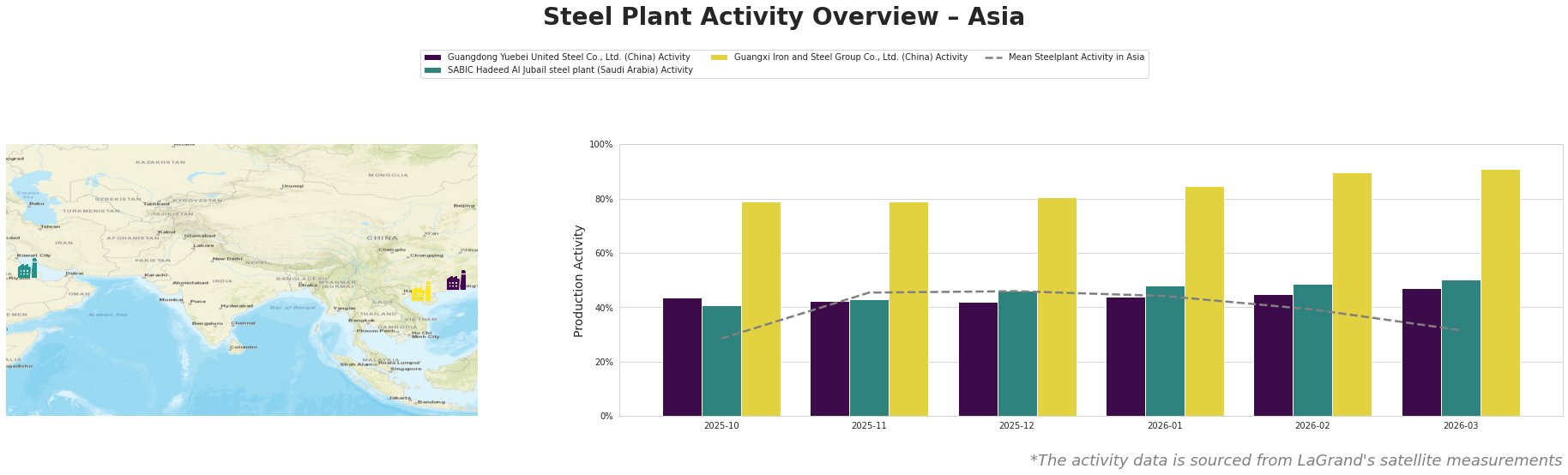 Steel activity in Asia has experienced fluctuations with recent reports reflecting the impact of rising production costs and geopolitical tensions. “European steel HRC import prices up amid limited supply, higher costs“ and “European domestic steel CRC, HDG prices still rising amid limited imports“ indicate that ongoing conflicts and increased freight costs have disrupted supply chains, influencing local demand for imported steel in Asia. Correspondingly, satellite data shows a drop in average steel plant activity from 39% in February to 32% in March, suggesting a cautious approach among producers amid these pressures.