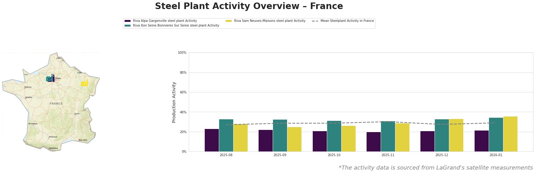 Activity levels for the Riva Alpa Gargenville steel plant have shown a downward trend, with a notable drop to 20% in November 2025, linking to declining production levels reported. Conversely, the Riva Iton Seine Bonnieres Sur Seine steel plant maintained relatively stable activity levels around 31-34% throughout the observed period, despite market conditions. Similarly, the Riva Sam Neuves-Maisons steel plant experienced a rise to 36% activity in January 2026, reflecting possible adjustments to changing market dynamics connected to the production cost increases addressed in recent articles.