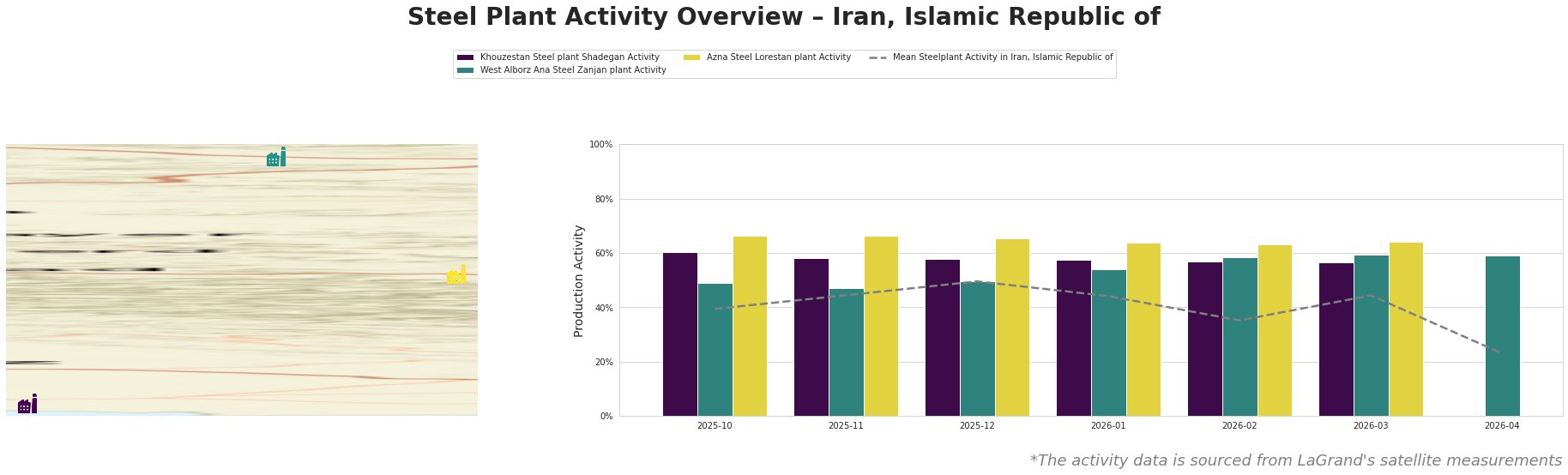Activity levels show a notable decline; the overall mean dropped sharply from 44.0% in March to 23.0% in April. Khouzestan Steel has been particularly affected, with no recent reported activity due to ongoing repairs. This is consistent with “Iran steel supply unlikely to benefit from ceasefire,” which mentions production halts due to airstrike damages. In contrast, West Alborz Ana Steel’s activity remains stable at 59%, indicating some resilience amidst the broader downturn.