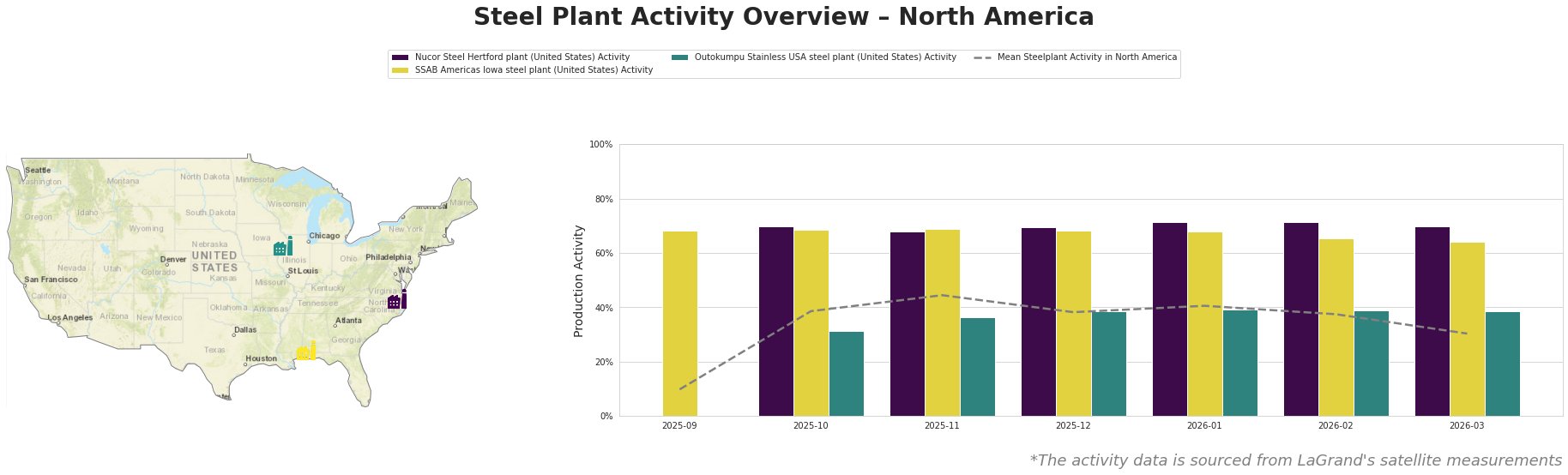 The North American steel market exhibits a neutral sentiment, influenced by recent pricing trends and production fluctuations. Notably, Nucor has raised the price of hot-rolled coil to $1,025 per ton (2026-03-23), which coincided with a recent establishment of price stability in European markets, as highlighted in the article, Domestic HRC steel prices in Europe remain stable amid import restrictions and low consumption (2026-03-20). Although direct connections between global market shifts and local plant activity are limited, satellite data reveals interesting trends.
