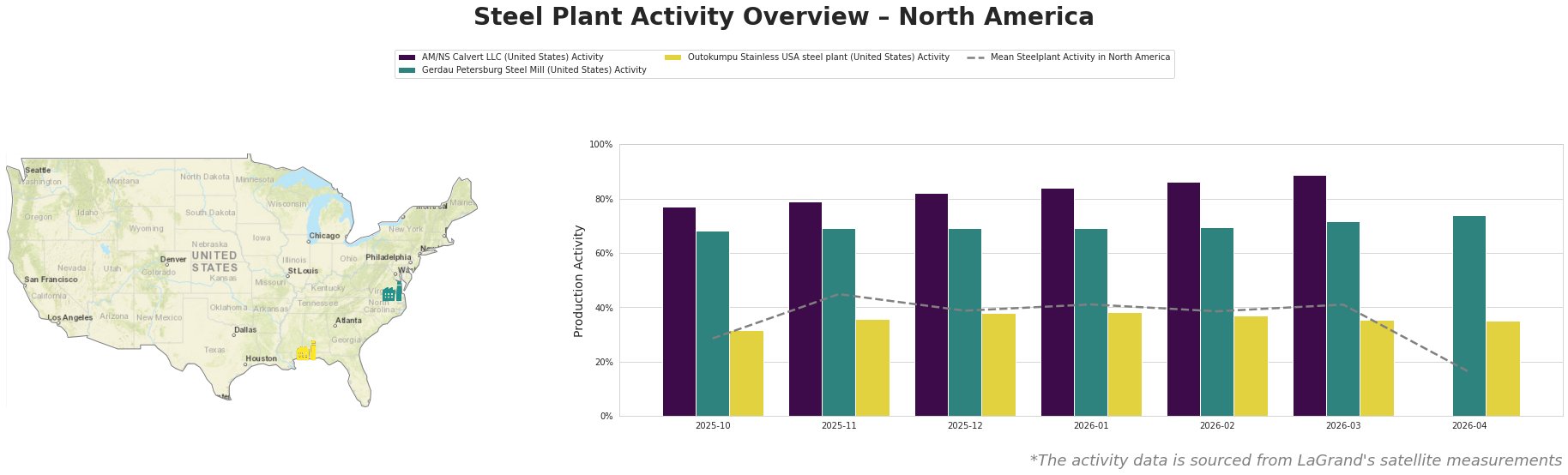 The data illustrates a fluctuating yet upward trend in plant activity prior to a notable decline in April 2026, with AM/NS Calvert LLC peaking at 89.0% activity in March, reflective of robust operations in the automotive and infrastructure sectors. Gerdau Petersburg maintains steady output, showcased by its activity remaining above 68%, amidst strong structural demands. Outokumpu, however, experienced low peaks, fluctuating between 32% and 38%, with no direct recent developments tied to its operations observed in the news.
