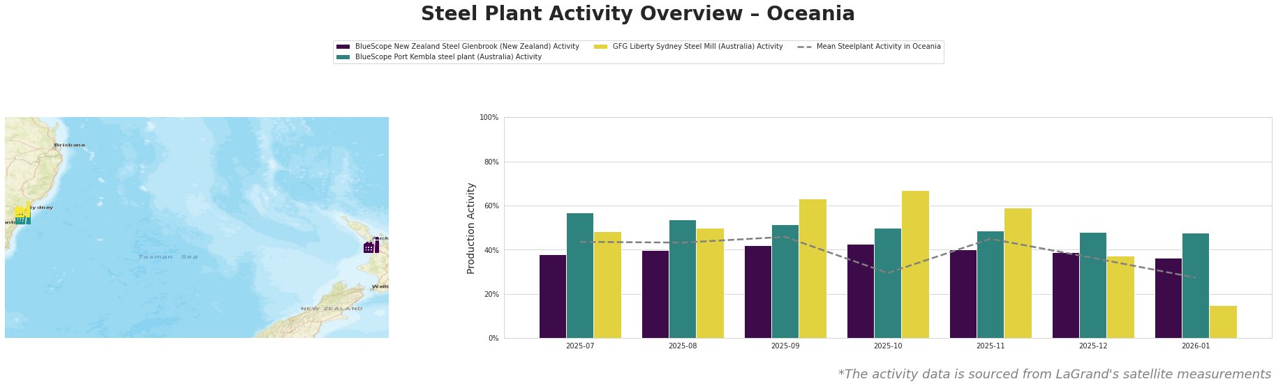 Recent changes indicate a notable decline in mean activity levels, dropping from 45.0% in November 2025 to 27.0% by January 2026, with individual plant fluctuations reflecting this trend. GFG Liberty Sydney Steel Mill faced a significant decrease, plummeting from 59.0% in November 2025 to just 15.0% in January 2026, indicating substantial operational challenges, likely related to external market conditions.