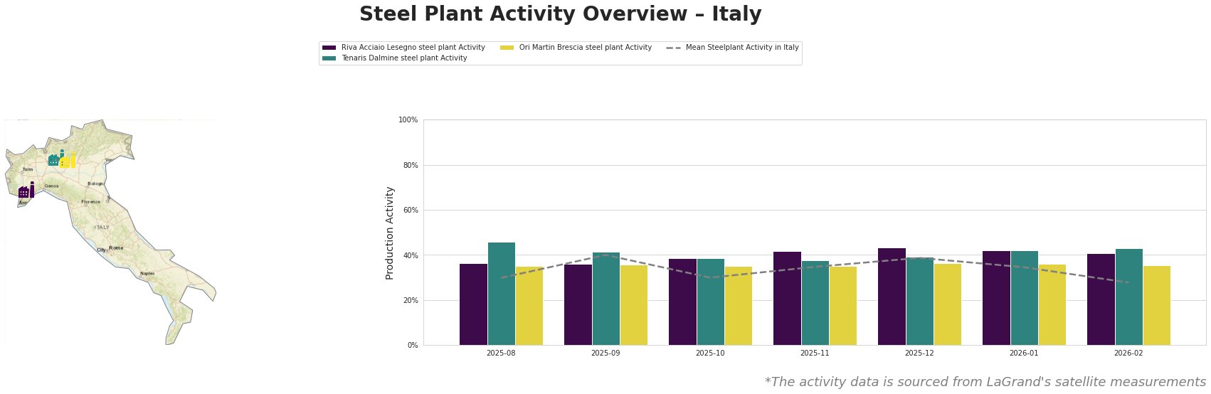 Recent observed activity levels indicate a generally stable situation across the sector, with individual plants exhibiting varying degrees of fluctuations. For instance, Riva Acciaio Lesegno experienced a peak of 43.0% in December but then dipped to 41.0% in February 2026. Meanwhile, Tenaris Dalmine peaked at 46.0% in August and later increased to 43.0% by February. Ori Martin Brescia has shown consistent activity levels around the lower bands.