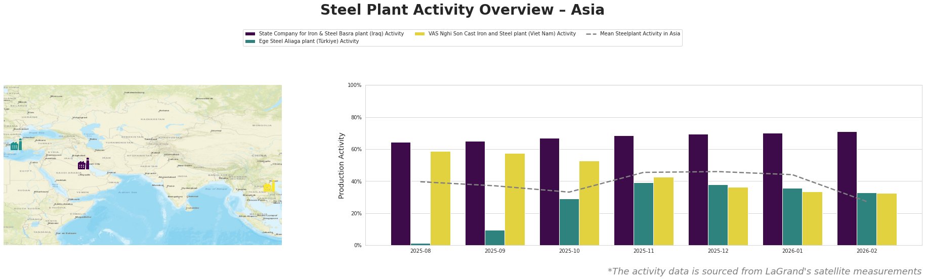Bar chart and satellite map of steel production activity in Asia