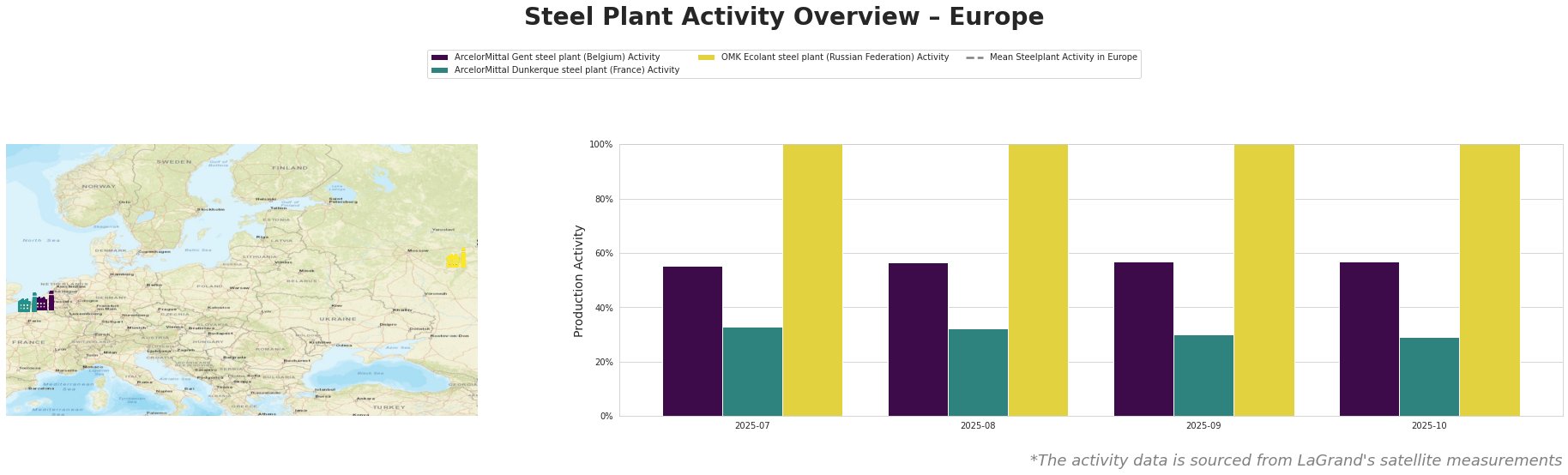The data indicates that the ArcelorMittal plants in Gent and Dunkerque have maintained steady activity levels despite slight fluctuations; Gent remains notably higher than Dunkerque. The activity in Gent remained stable at 57% through August and September, while Dunkerque saw a decrease to 30% by October. In contrast, OMK Ecolant consistently reported a high activity of 61.8%, reflecting robust performance possibly linked to ongoing production demands.