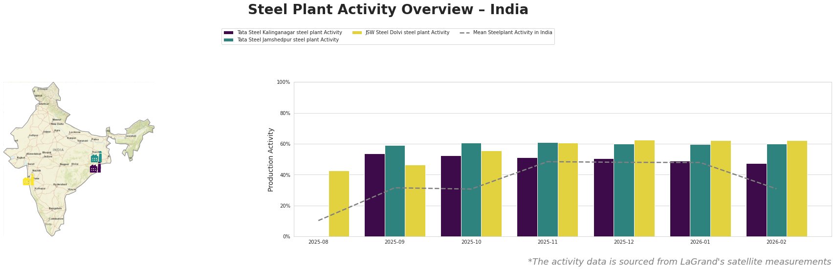 The Tata Steel Kalinganagar steel plant, located in Odisha, reported a notable drop to 47% activity in February 2026, following a peak of 54% in September 2025. This aligns with Voestalpine’s strategic focus, suggesting that competitive pressure may influence production schedules. The plant supports the automotive sector with a crude steel capacity of 3,000 MTPA generated through integrated blast furnace technology.
