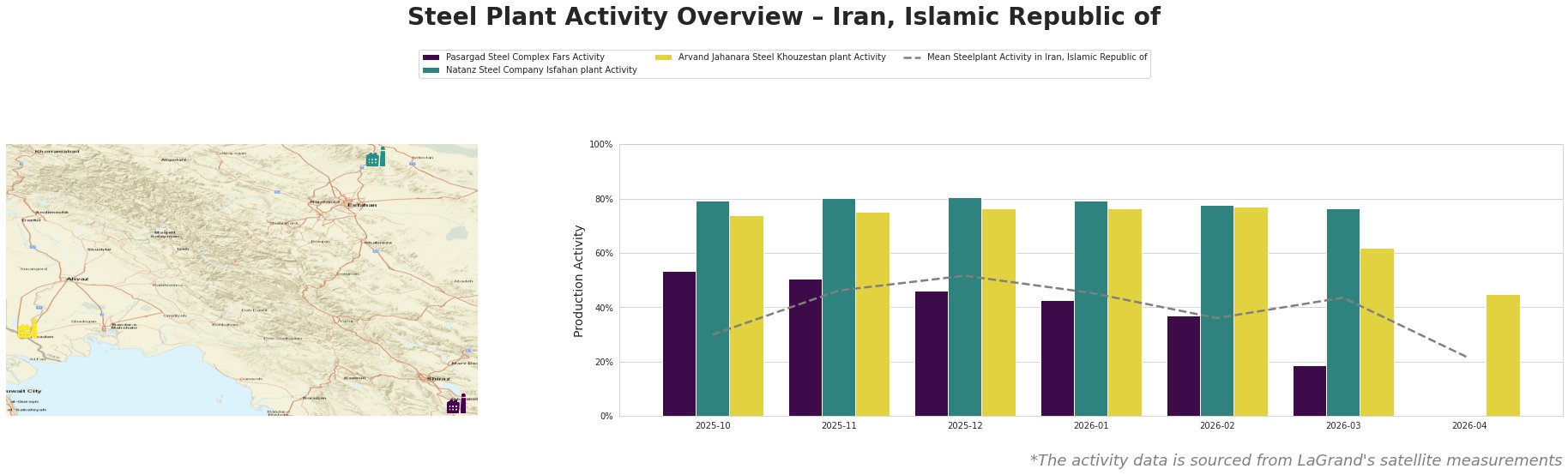 Bar chart and satellite map of steel production activity in Iran, Islamic Republic of