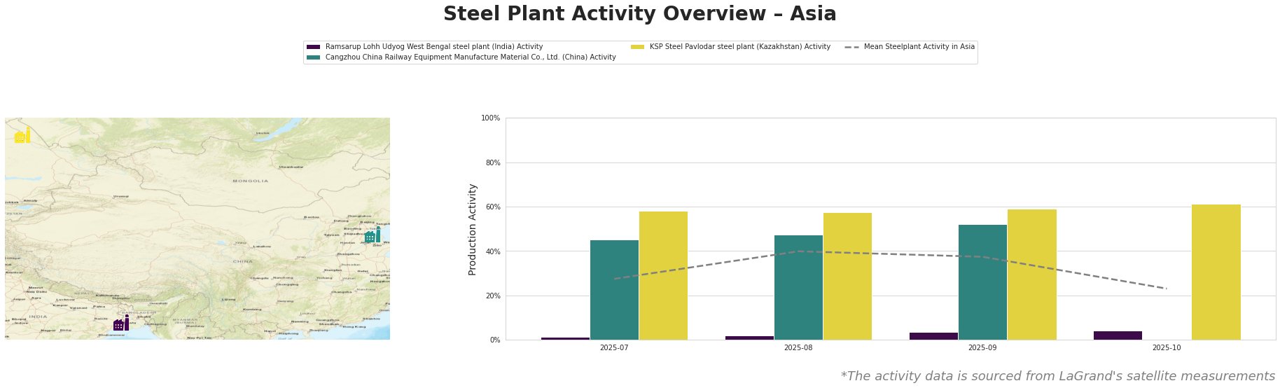 The Ramsarup Lohh Udyog West Bengal steel plant in India has experienced a gradual increase from 1.0% in July to 4.0% by October, reflecting the lowest overall activity compared to its peers. Despite this rise, it pales in comparison to the mean activity level of 27.0%, suggesting challenges in scaling production effectively. The plant’s integrated processes support various finished and semi-finished products, primarily serving the energy sector, but remain constrained at low operational outputs with no clear source of growth indicated by recent news.