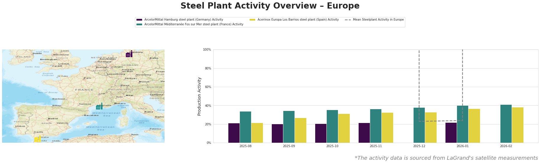 The ArcelorMittal Méditerranée Fos sur Mer steel plant shows consistent upward growth peaking at 41% in February 2026, indicating robust engagement in production amid rising demands, potentially driven by anticipations around the forthcoming CBAM initiative. Notably, its operational resilience may contribute positively to the anticipated European market shifts highlighted in the articles.