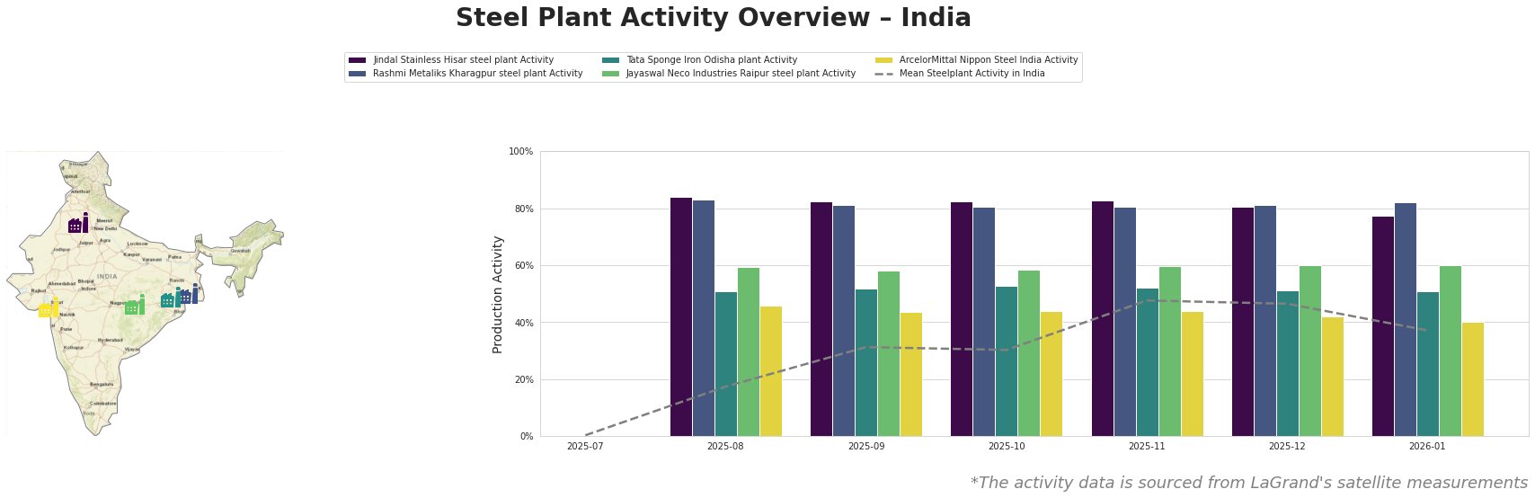 Bar chart and satellite map of steel production activity in India