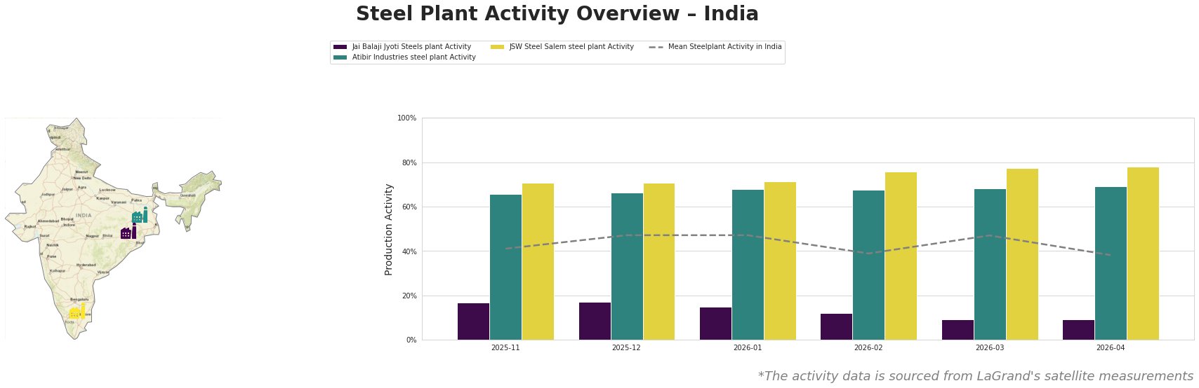 The satellite-observed activity levels show distinct trends among Indian steel plants. JSW Steel Salem has consistently demonstrated high activity, peaking at 78% in April 2026, making it a critical player in supporting export growth. Conversely, Jai Balaji Jyoti Steels has seen a steep decline, dropping to 9% during the same period with no clear connection to the identified demand increase in exports. As reported in “Global production has been declining for the seventh month in a row,” India’s production nevertheless grew by 9.4% in March 2026, demonstrating resilience amid global trends.