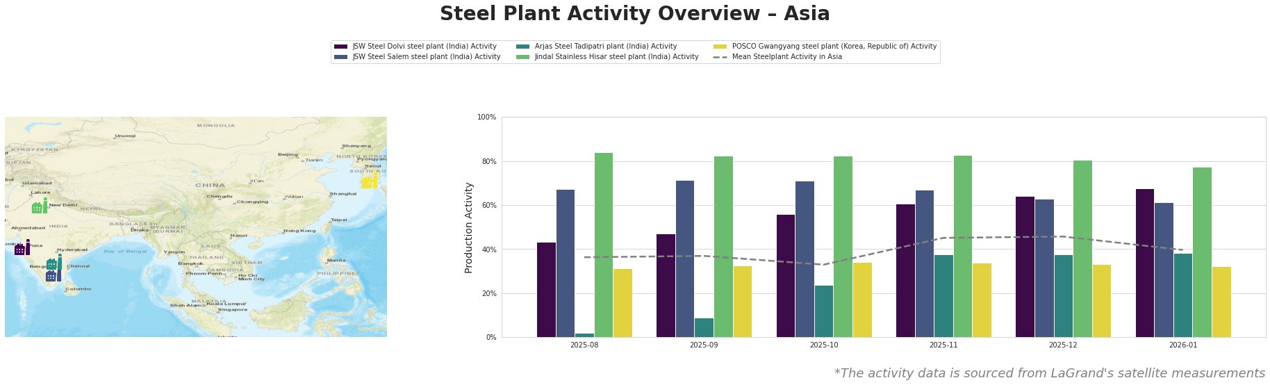 Bar chart and satellite map of steel production activity in Asia