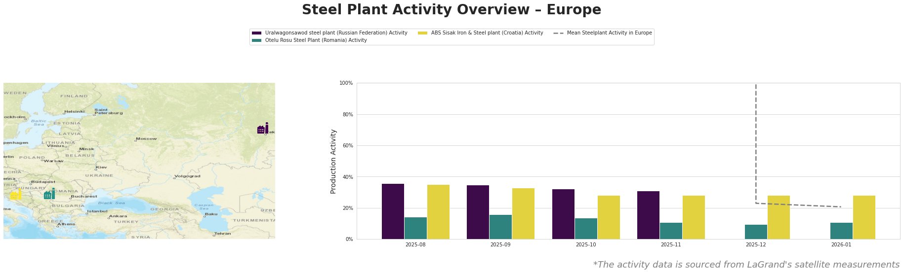 The activity levels of steel plants in Europe showed significant fluctuations. Notably, Otelu Rosu experienced a drop to 9.0% in December before rising to 11.0% in January, potentially reflecting responses to improved sentiment following Trump’s tariff withdrawal. Meanwhile, both the Uralwagonsawod and ABS Sisak plants maintained activity in the low to mid-thirties percentage range except for a significant dip in December, linking their downturn to the heightened trade tensions reflected in “Trump scraps plans for additional tariffs on a number of European countries.”