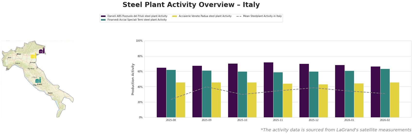 The activity levels across these plants indicate varied trends, especially with Danieli ABS Pozzuolo del Friuli showing a consistently higher activity, peaking at 72% in November 2025. This surge aligns favorably with the increase in regional steel demand and indicates robust operational practices, although specific news connections were not noted. Conversely, Finarvedi’s Terni facility displayed notable resilience, maintaining above-average activity levels, possibly benefitting from broader strategic decisions in Italy’s steel sector as indicated by the restructuring efforts highlighted in “Acciaierie d’Italia plans ramp-up in steel output to 4 million tpy amid government-led restructuring.”