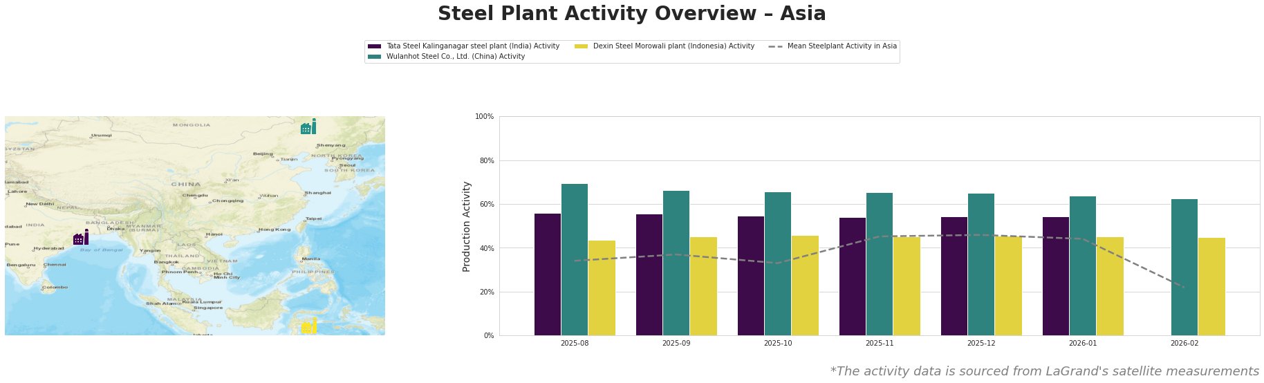 Tata Steel Kalinganagar maintained a relatively stable activity level, peaking at 56.0% activity even as total Asian activity declined to a mean of 22.0% in February 2026. This drop corresponds with no direct news linkage, indicating potential seasonal variations or adjustments in production scheduling.