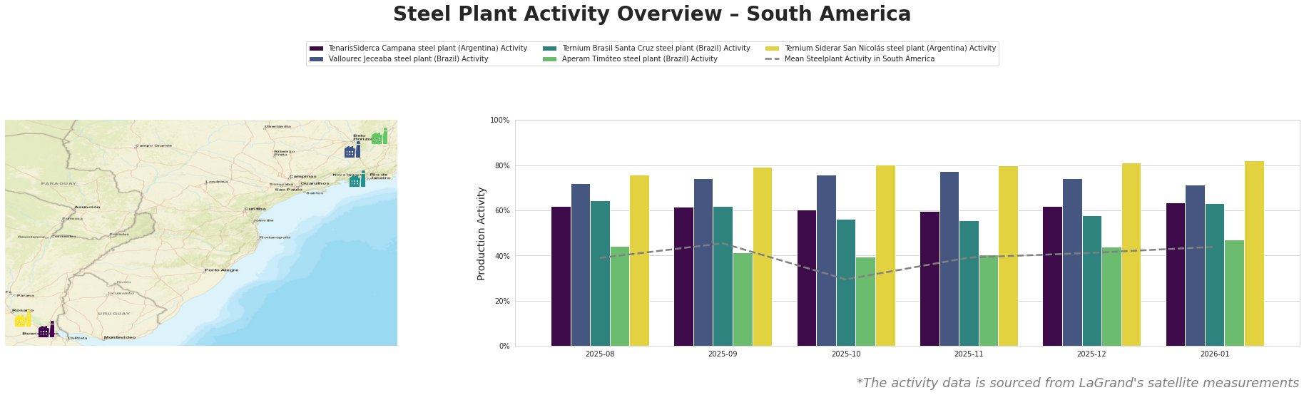 Bar chart and satellite map of steel production activity in South America