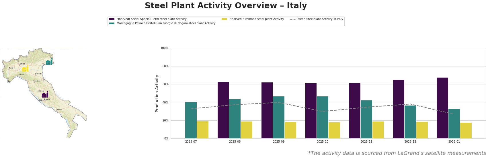 Bar chart and satellite map of steel production activity in Italy
