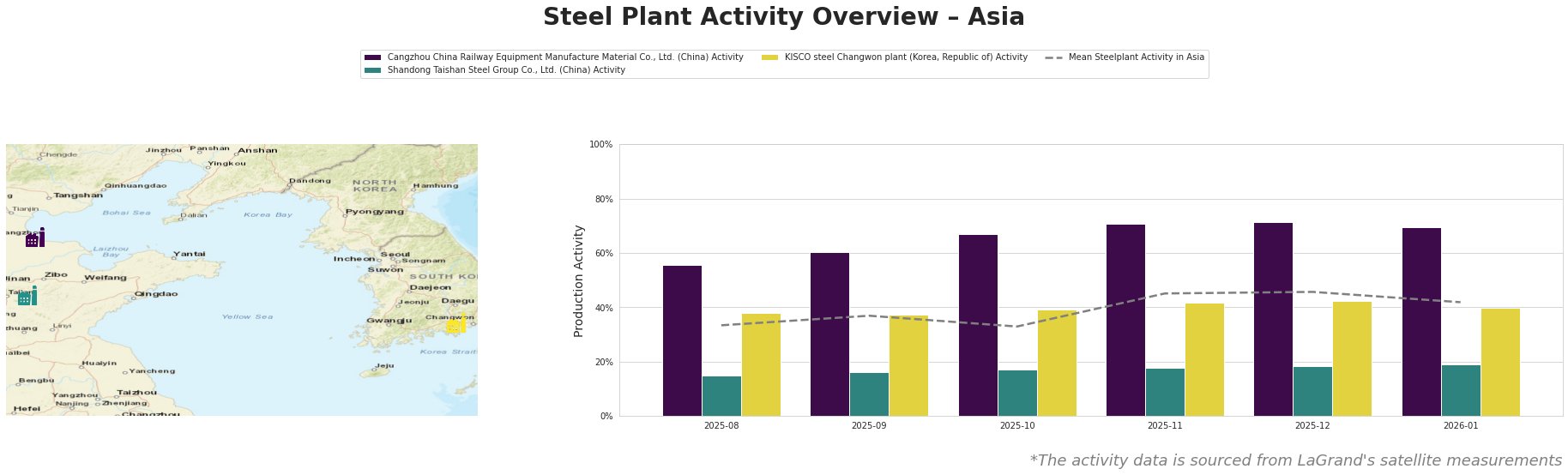 In recent months, the Cangzhou China Railway Equipment Manufacture Material Co., Ltd. has shown a notable increase, peaking at 71% activity in November and December. This rise may reflect broader market stability as mentioned in Nucor raises prices for hot-rolled coil in the US for the second week in a row. Conversely, Shandong Taishan Steel Group Co., Ltd. remains at lower activity levels, only reaching 19% in January—potentially impacted by competitiveness and supply chain dynamics. Meanwhile, the KISCO steel Changwon plant shows stable output in the low 40% range, suggesting a consistent operational approach that aligns with ongoing demand, although no specific news article connects these levels directly.