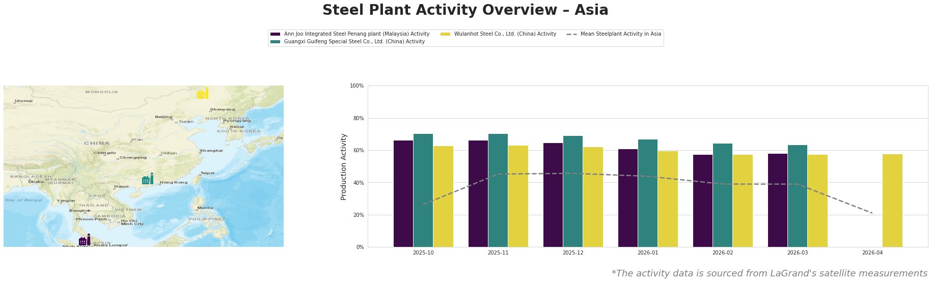 The Ann Joo Integrated Steel Penang Plant saw a decrease from 66% to N/A in April, potentially attributed to cautious approaches surrounding regional tensions highlighted in “Trump threatens death of Iranian civilization: Update.” The mean activity level of 21% signifies a notable downturn, which may suggest supply chain considerations amidst uncertainty.