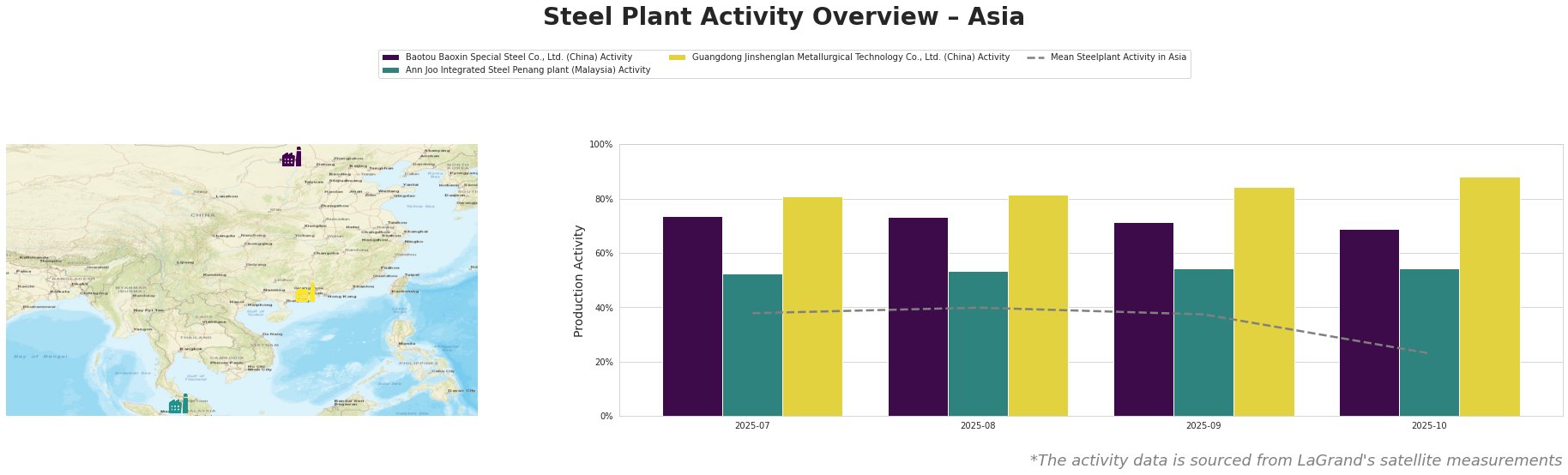 The overall activity of steel plants in Asia has fluctuated notably, particularly dropping to 23% by October 2025. The drop aligns with China’s forecasted decline in rolled steel consumption, indicating a reaction to diminished demand, especially in construction, linked to current economic conditions. Baotou Baoxin showed resilience with activity peaks around 74%, though it declined by 5% to 69% in October, likely reflecting the increase in emissions reported earlier. Ann Joo’s activity remained comparatively stable around 52-54%, indicating consistent operational capacity.