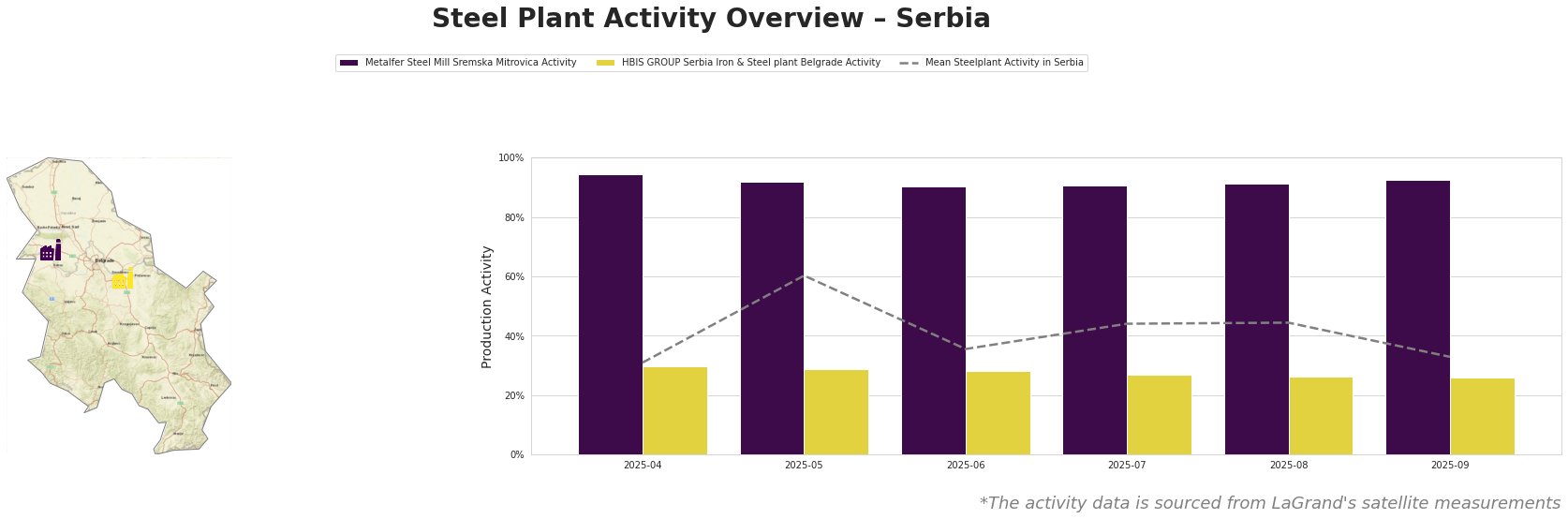 Metalfer Steel Mill Sremska Mitrovica, located in Vojvodina, has a crude steel capacity of 500 ttpa using electric arc furnace (EAF) technology and produces semi-finished and finished rolled products, including rebar and billets. Notably, satellite data reveals consistently high activity levels (90-94%) between April and September. This suggests stable operations unaffected by the issues impacting HBIS or broader market concerns. While Metalfer is powered by renewable energy, according to its profile, it is not explicitly mentioned in any of the provided news articles, therefore no direct connection can be established between its activities and the news articles provided.