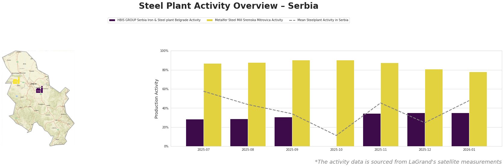 Bar chart and satellite map of steel production activity in Serbia