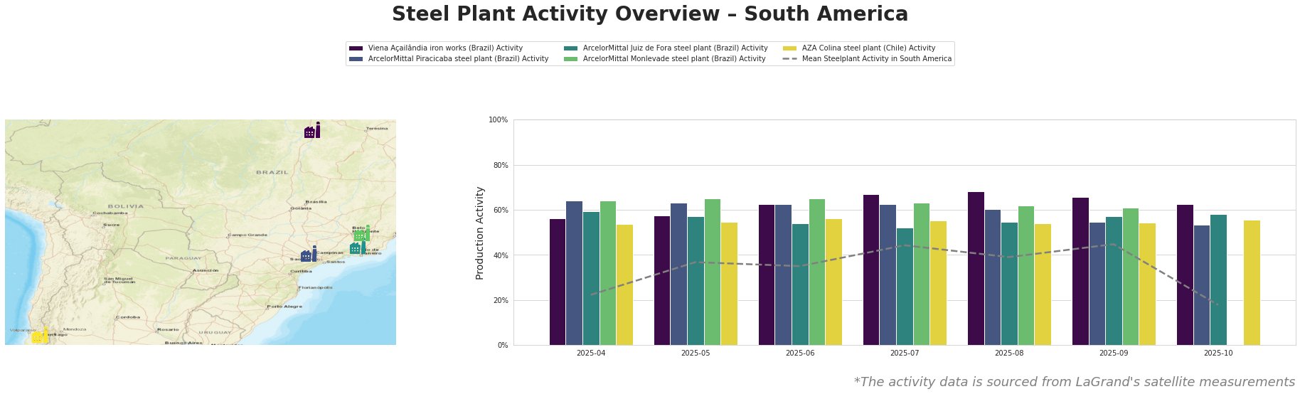 AZA Colina steel plant in the Región Metropolitana, Chile, has a 520 ttpa crude steel capacity using EAF technology. Its activity remained consistently close to the average across the South American plants. No direct connection between the Chilean plant’s activity and the COP30-related news can be established.