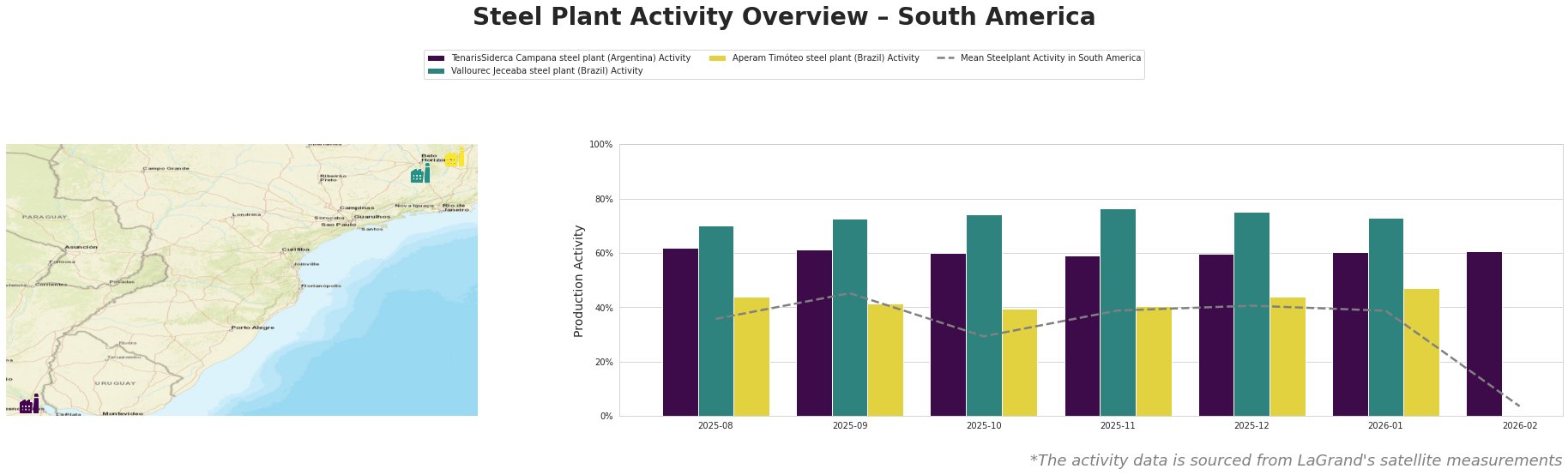 Bar chart and satellite map of steel production activity in South America
