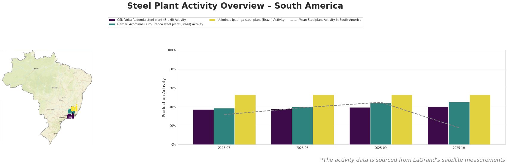 Over the observed months, the mean activity level across steel plants in South America has fluctuated, peaking at 45% in September. The CSN Volta Redonda plant demonstrated stability, maintaining around 39%-40% but experienced a drop to 32% in October. Gerdau Açominas showed a consistent activity range, with an increase to 45% by October, indicating robust demand dynamics. Notably, Usiminas Ipatinga maintained a solid focus with stable output around 53%, aligning with the optimistic sentiment in industrial sectors as highlighted in the aforementioned news article.