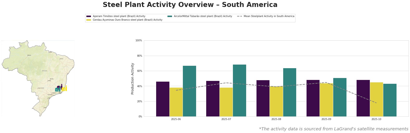 ArcelorMittal Tubarão steel plant: Situated in Espírito Santo, Brazil, this integrated BF-BOF plant has a large crude steel capacity of 7500 ttpa. The plant generates a significant portion (approximately 115%) of its energy needs from process gases. Despite a peak activity of 68.0% in July, a notable decrease to 43.0% was observed in October 2025. Despite the drop in activity, no direct correlation can be established between this decrease and the COP30 news.