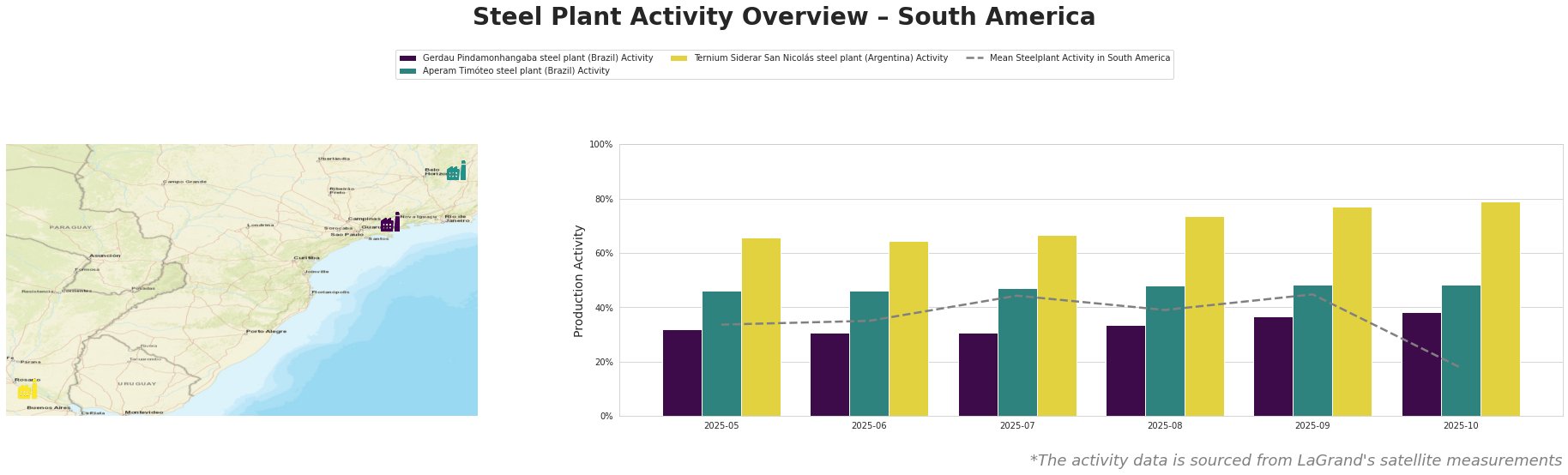 South America’s steel market demonstrates positive momentum. Observed changes in plant activity levels are viewed in the context of the upcoming UN climate conference in Brazil as described in “Cop 30 success hinges on GHG cuts, finance response” and “EU-Staaten beschließen Klimaziel für 2040“. No direct link, however, can be established between the news articles and recent observed changes in plant activity levels.