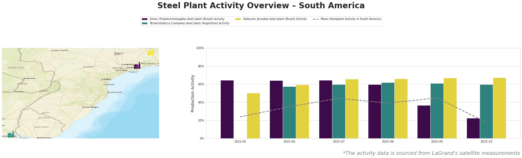 The mean steel plant activity in South America fluctuated, peaking at 45% in September 2025 before dropping to 18% in October 2025.