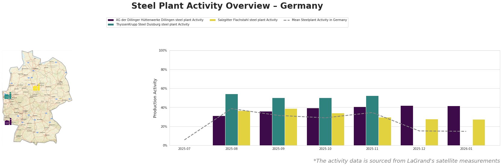The AG der Dillinger Hüttenwerke steel plant, situated in Saarland, demonstrates significant historical production capabilities including a 2,760 kt crude steel capacity, largely focused on high-value finished products such as non-alloy structural steels. Satellite data indicates a robust operational performance, with activity peaking at 42.0% in December 2025, a figure that hints at a strong market response to procurement needs. This sustained activity is noteworthy particularly as the company emphasizes sustainable practices. However, the potential impacts of commodity supply changes following the Klöckner acquisition may influence future operational efficacy.
