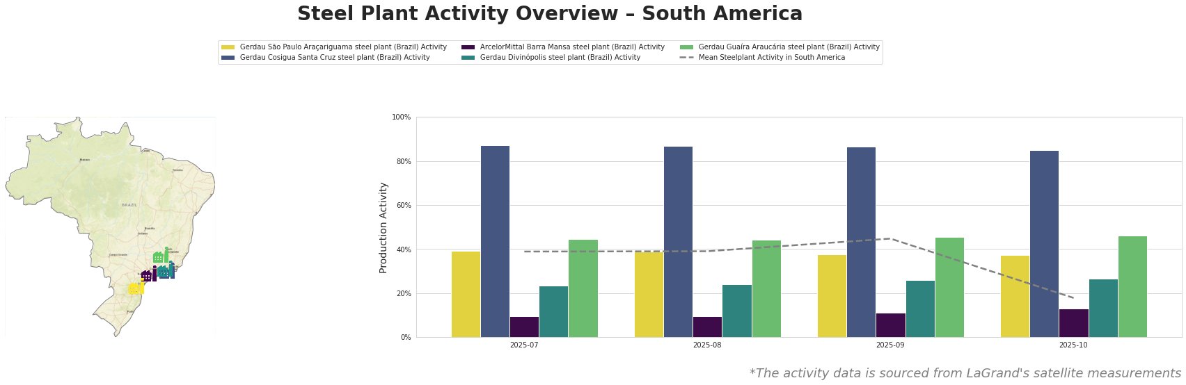 Gerdau São Paulo Araçariguama recorded a moderate activity of 39% in July and August 2025, but it declined to 37% in October. This decrease reflects underlying market anxieties that may be directly related to the escalating crisis in Venezuela discussed in “Trump sees role in Venezuela after military strike.” The plant operates EAF systems, producing semi-finished products primarily for construction, which could become less available if political tensions disrupt supply channels.