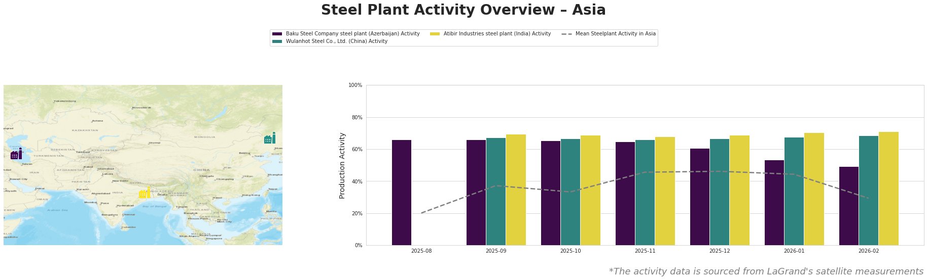 The observed trend of declining average activity levels in Asia, from 46% to 29% within six months, is alarming. Both Baku and Wulanhot steel plants appear affected, as the Baku plant struggles with a notable drop in activity.