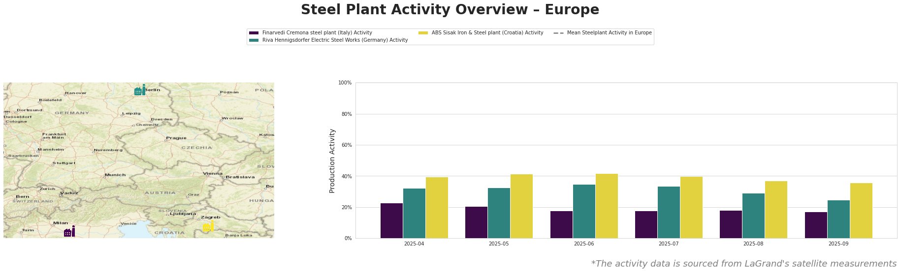 Riva Hennigsdorfer Electric Steel Works, with a 1 million tonne per year EAF capacity producing steel billets and rebar, experienced a similar downward trend. Activity levels declined from 32% in April to 25% in September. While the Hennigsdorf plant is in Germany, where Stellantis is also cutting production (“Stellantis to suspend production at several European plants“), a direct causal link between Stellantis’s announcements and this specific plant’s activity cannot be definitively established based solely on the provided information.