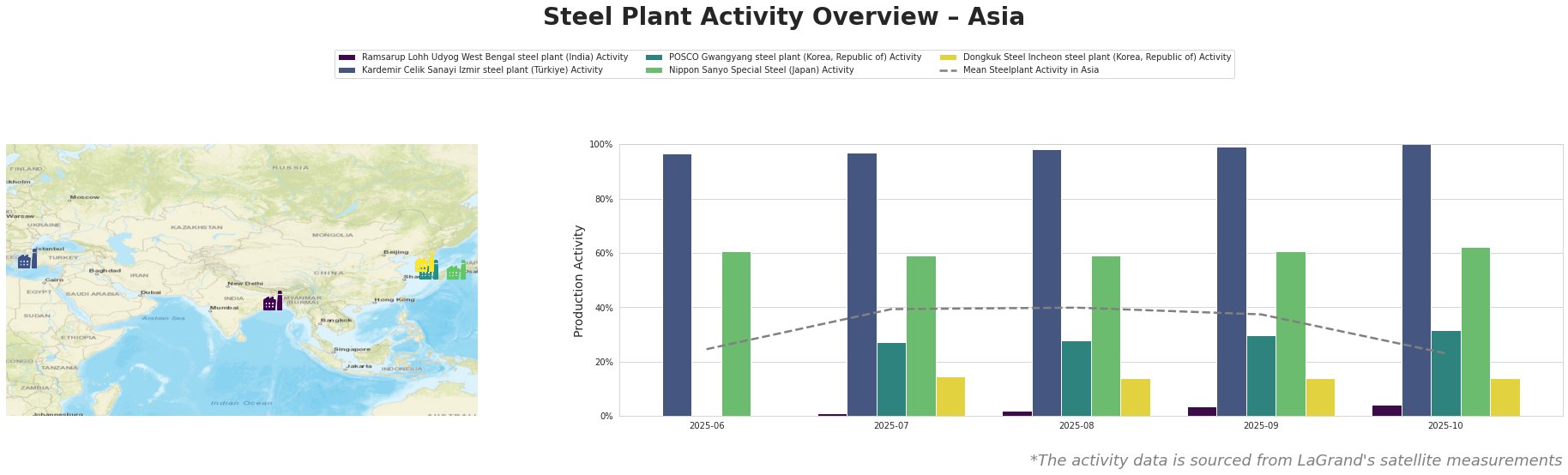 Bar chart and satellite map of steel production activity in Asia
