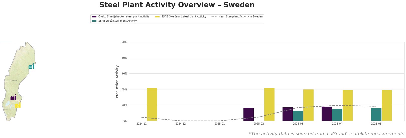 SSAB Luleå’s activity has remained relatively robust, with readings climbing from 13% to 16% in May 2025, aligning with the recent financing news and the upcoming plant transformation. Meanwhile, Ovako Smedjebacken’s activity remains low, hovering at 16% in February 2025. Notably, SSAB Oxelösund sustained its activity at around 39-40%, indicating stability but not direct correlation to the latest financial developments.