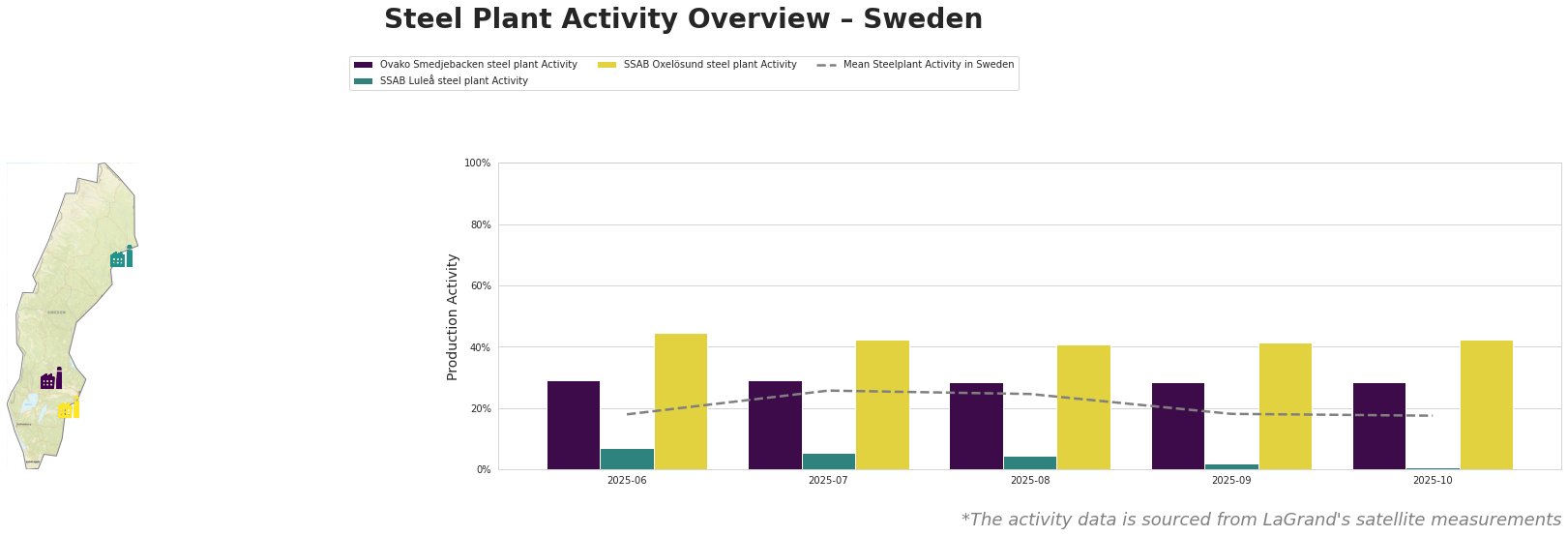 Sweden’s steel market shows strong positive momentum. Recent developments are driven by SSAB’s expansion plans and significant funding boosts for green steel initiatives. The favorable court ruling on “Court confirms SSAB’s permit to build and operate a plant in Luleå” directly enables expansion of production capacity. While “Stegra received a $41 million government grant from Sweden” and “Stegra receives additional EUR 37 million support for zero-emission steel plant” indicate substantial investment in green steel production, no direct immediate relationship to current observed plant activity levels can be established.