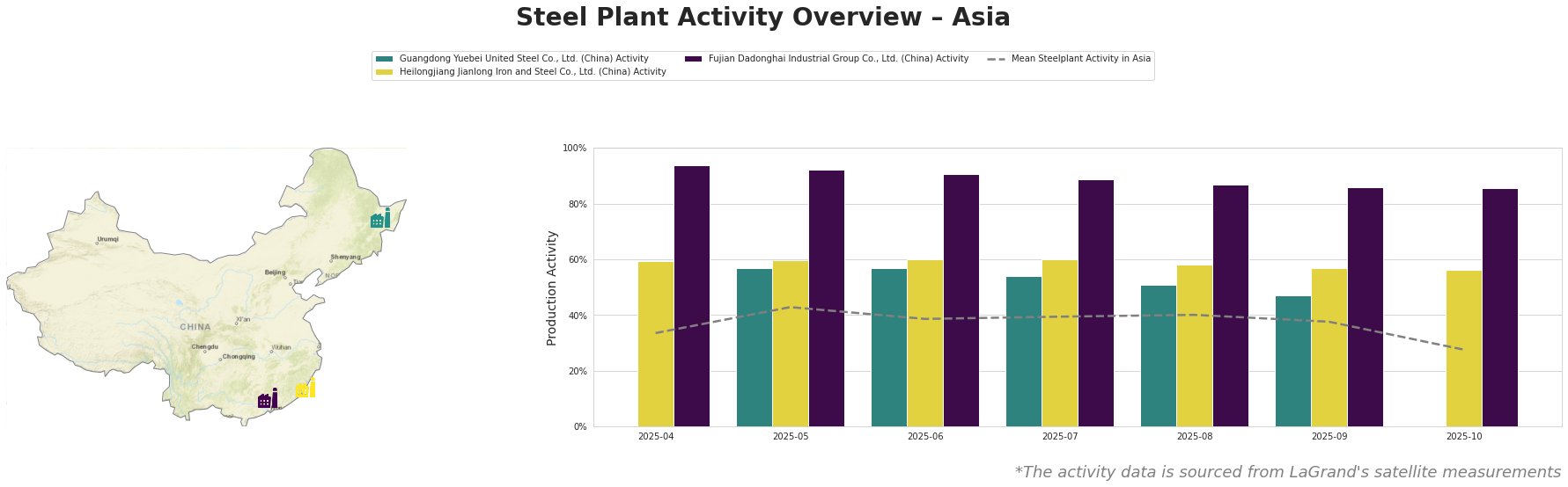 The mean steel plant activity in Asia shows a declining trend, especially noticeable in October 2025, dropping to 28.0% after hovering around 39-43% in the previous months. Guangdong Yuebei United Steel Co., Ltd., a rebar producer with integrated BF and EAF processes, shows a decline in activity from 57.0% in May-June to 47.0% in September. No data is available for April and October. Heilongjiang Jianlong Iron and Steel Co., Ltd., also an integrated BF/BOF producer focusing on rebar, hot rolled ribbed steel bars and seamless steel tubes, maintained relatively stable activity, fluctuating between 56% and 60% over the observed period. Fujian Dadonghai Industrial Group Co., Ltd., another rebar-focused integrated BF/BOF producer, demonstrates the highest activity levels among the observed plants, but steadily decreasing from 94.0% in April to 86.0% in September and October. There is no immediately apparent link between the activity levels of these Chinese plants and the Turkish export trends reported in the news articles.