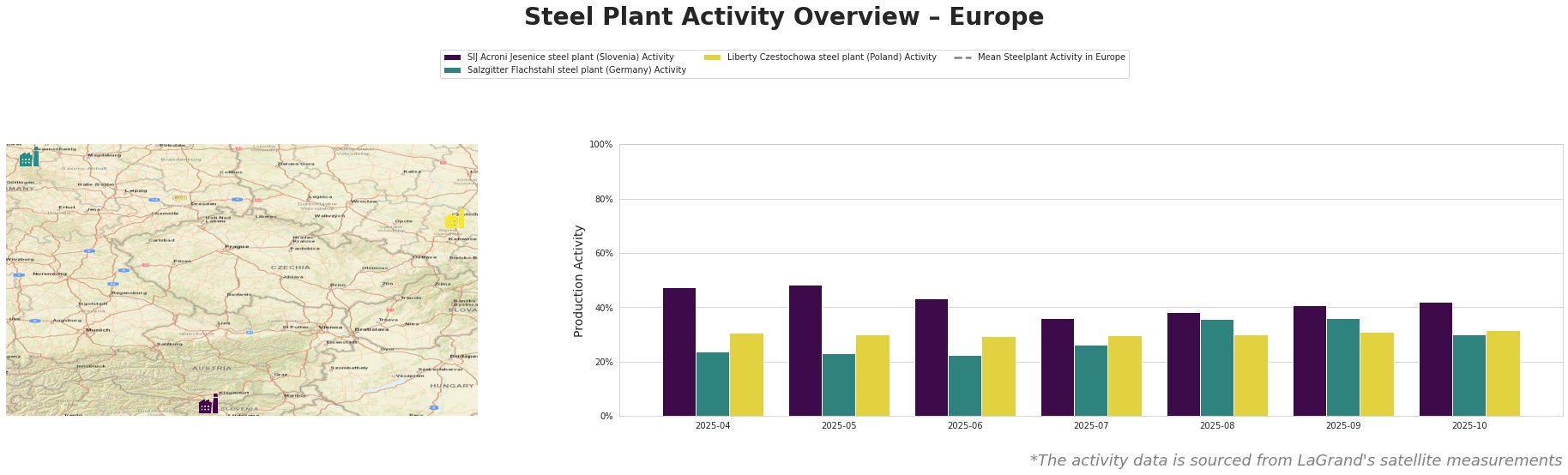 The Mean Steelplant Activity in Europe varied significantly from April to October 2025. SIJ Acroni Jesenice steel plant showed fluctuations, with a notable dip to 36% in July before recovering to 42% in October. Salzgitter Flachstahl steel plant saw a steady increase, peaking at 36% in August and September before decreasing to 30% in October. Liberty Czestochowa steel plant remained relatively stable throughout the period, hovering between 30% and 32%. The activity levels observed in SIJ Acroni Jesenice steel plant, Salzgitter Flachstahl steel plant, and Liberty Czestochowa steel plant will be reviewed but no direct relationship can be established.