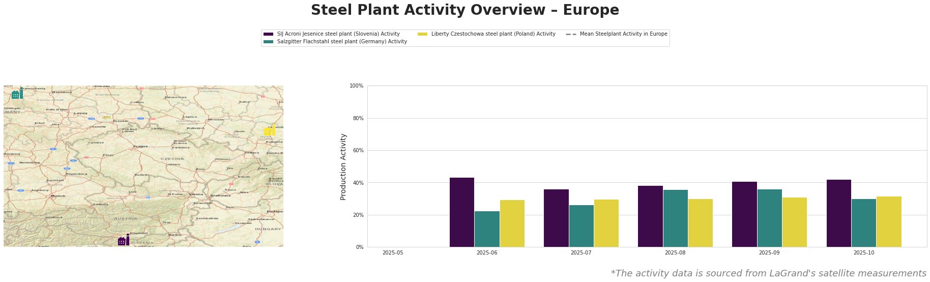 Liberty Czestochowa steel plant: The Polish EAF-based plant (840 thousand tons crude steel capacity) demonstrates a very stable activity level, fluctuating only slightly between 30% and 32% from June to October 2025. It specializes in plate production. The stability might reflect consistent demand for its specific product segment. There is no apparent correlation with the Ukrainian export trends highlighted in the provided news articles.