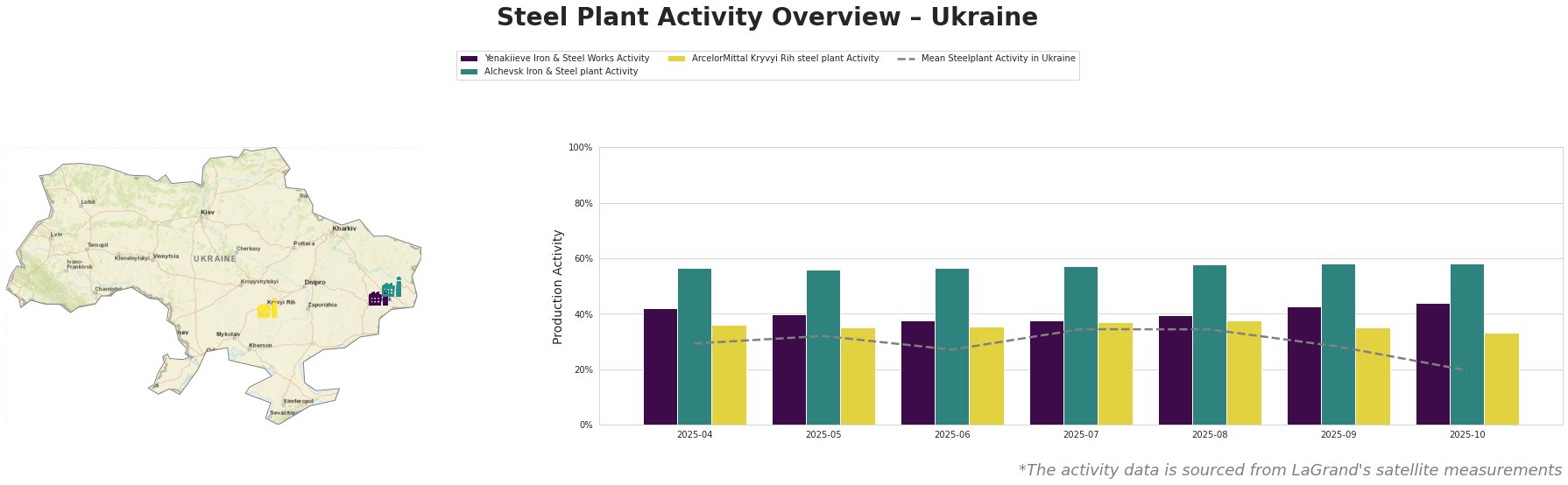 The mean steel plant activity in Ukraine shows volatility. Activity peaked in July-August 2025 at 34% and experienced the sharpest drop to 20% in October 2025.
