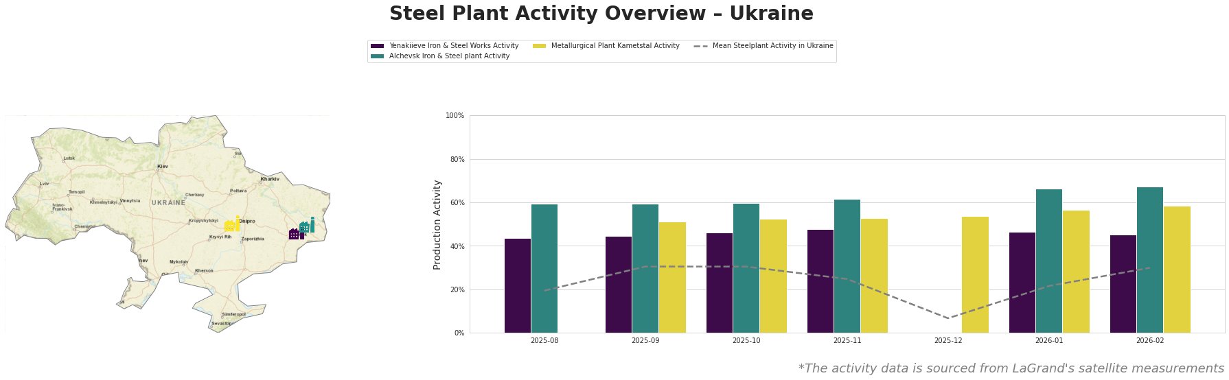 Yenakiieve Iron & Steel Works, with a capacity of 3.3 million tons, operates a BOF integrated process. In January 2026, activity stood at 46.0%, recovering from a December drop when it was not operational. Despite this recovery, it shows no direct correlation to the observed raise in total exports, as discussed in “Flat steel exports from Ukraine fell by 12.4% m/m in January.”