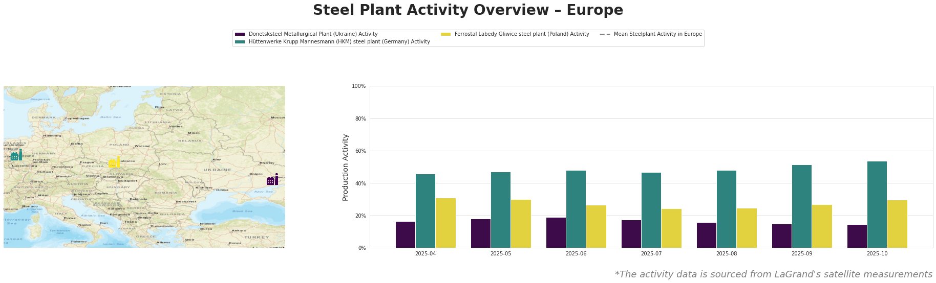 Hüttenwerke Krupp Mannesmann (HKM) steel plant, a major integrated BF-BOF producer in Germany with 6000 tons of crude steel capacity, exhibits a strong upward trend in activity, reaching 54% in October. No direct connection to the Ukrainian news articles can be established.