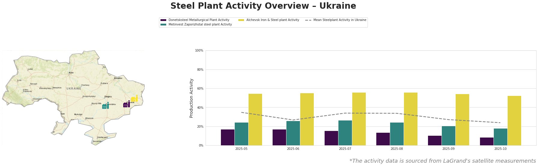 Alchevsk Iron & Steel plant in Luhansk, an integrated plant producing semi-finished and finished rolled products like slabs and structural shapes via BF/BOF technology, maintained the highest activity levels among the observed plants, remaining around 55%. The plant’s consistent high activity relative to the others, despite a small dip to 52% in October, could indicate differing regional dynamics or operational conditions. No direct link can be established between this relative stability and the named news articles.